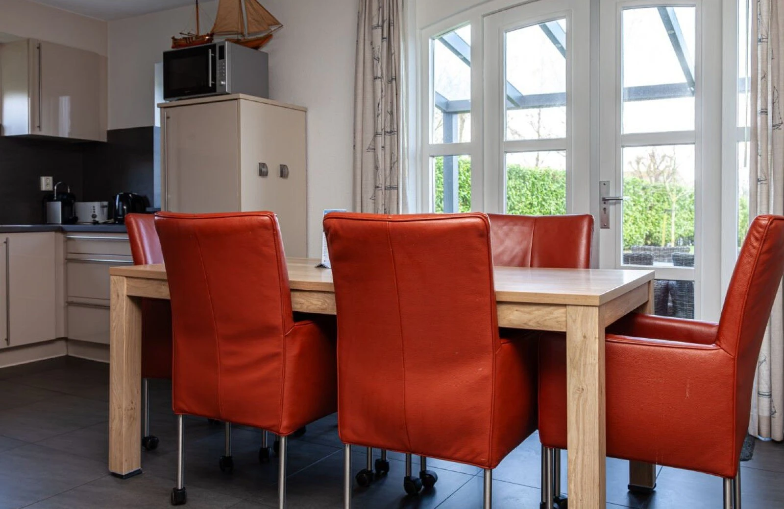 Binnen vind je een lichte, maritiem ingerichte woonkamer met open haard, een moderne keuken met o.a. vaatwasser, oven/magnetron en drie koffiemachines, en een badkamer met sauna. De slaapkamers zijn sfeervol ingericht, waarvan één beschikt over een balkon met panoramisch uitzicht.